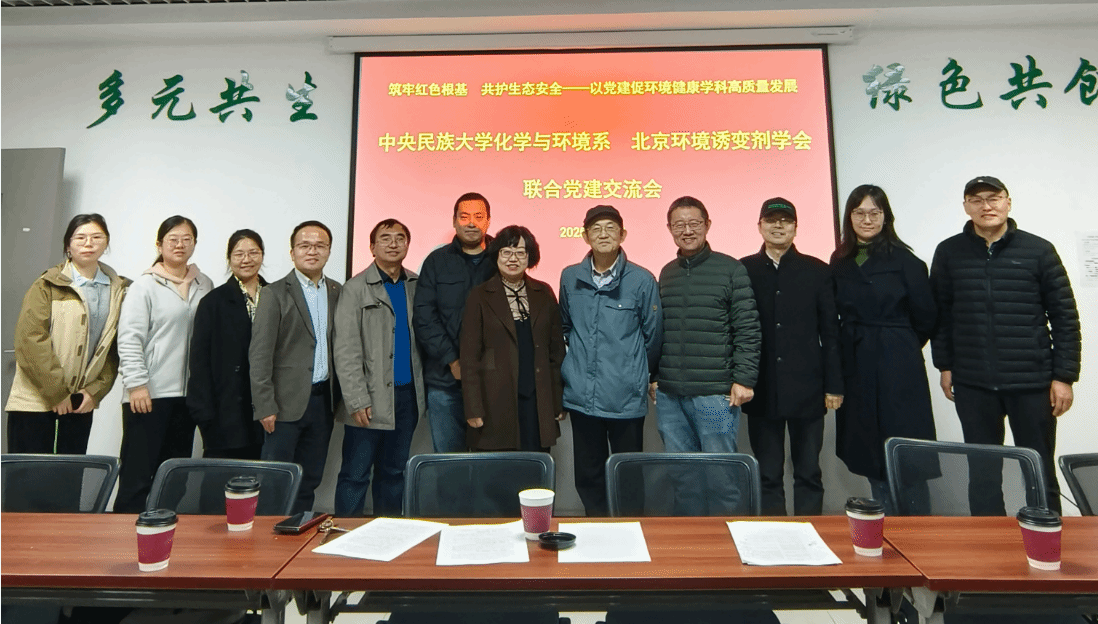 2025年10月24日14:00-18:00,中央民族大学生命与环境科学学院化学与环境系(简称化环系)教工第一党支部、第二党支部与北京市环境诱变剂协会党支部深度联动,共同举办“筑牢红色根基 共护生态安全——以党建促环境健康研究领域高质量发展”联合党建活动。北京市环境诱变剂协会理事长潘小川教授、副理事长兼秘书长靳洪涛教授、副秘书长李国星副教授等协会成员;生命与环境科学学院党委书记瓮建、院长张严、化环系教师代表及学生代表齐聚一堂,以“学术报告+学科研讨”的形式,共话环境健康研究前沿动态,共商学科高质量发展路径。活动由化环系第二党支部书记罗斐贤主持。