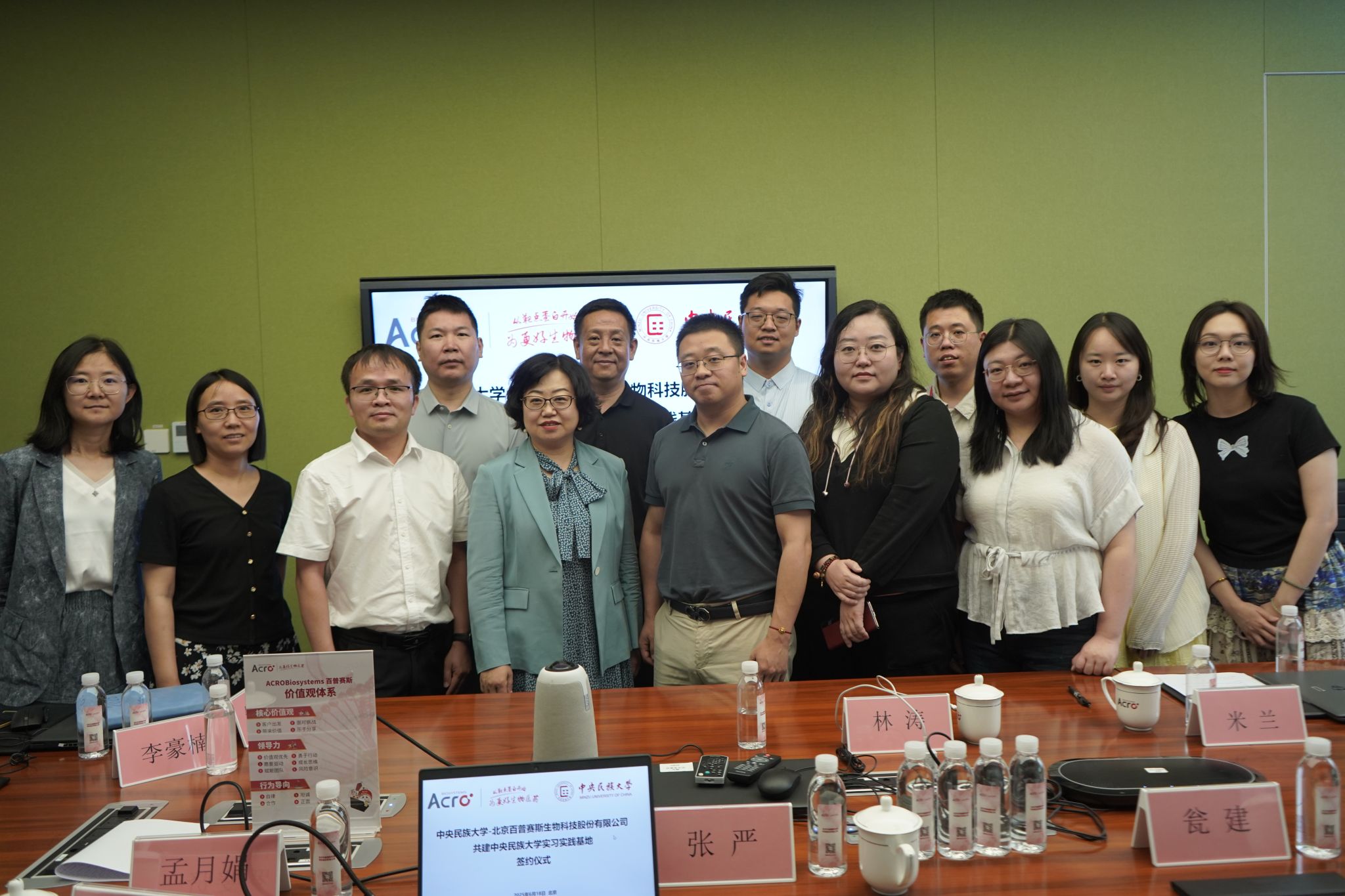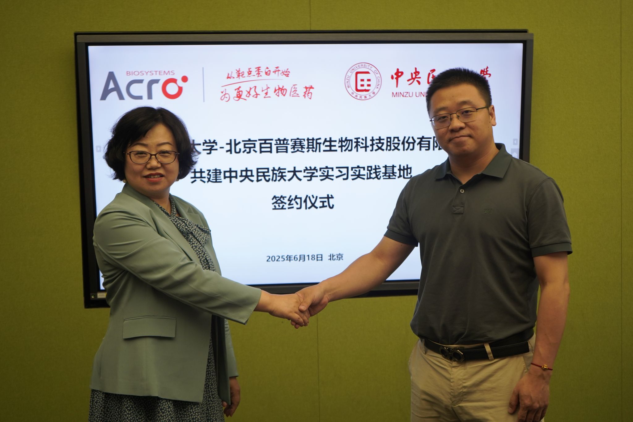 上午,学院代表团首先走访了国家"专精特新"企业——北京百普赛斯生物科技有限公司。在企业领导的陪同下,代表团参观了企业研发中心,深入了解生物医药领域的前沿技术和发展趋势。随后,与副总经理兼董事会秘书林涛、政府事务部经理朱艳泽、人力资源总监米兰、产品经理李豪楠博士等领导和科研骨干座谈,林涛副总经理详细介绍了企业发展历程、核心技术和人才需求。学院领导就学科建设、人才培养和科研创新等方面进行了全面介绍。双方围绕生物医药产业发展、技术攻关、人才培养等议题展开深入交流,并就建立长期合作关系达成共识。为进一步推动产教融合,双方现场签订了"中央民族大学实习实践基地"共建协议,标志着校企合作进入深度融合的新阶段。